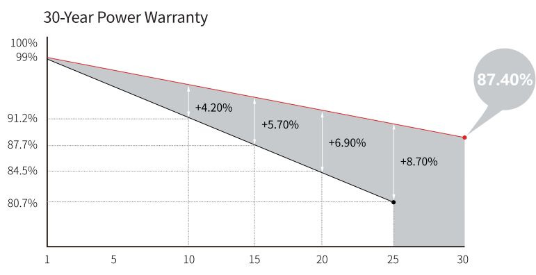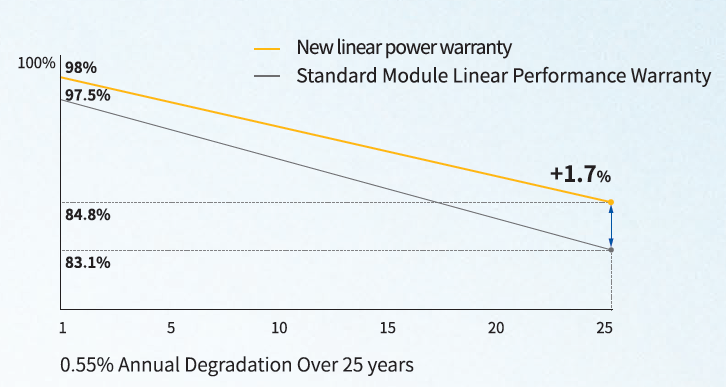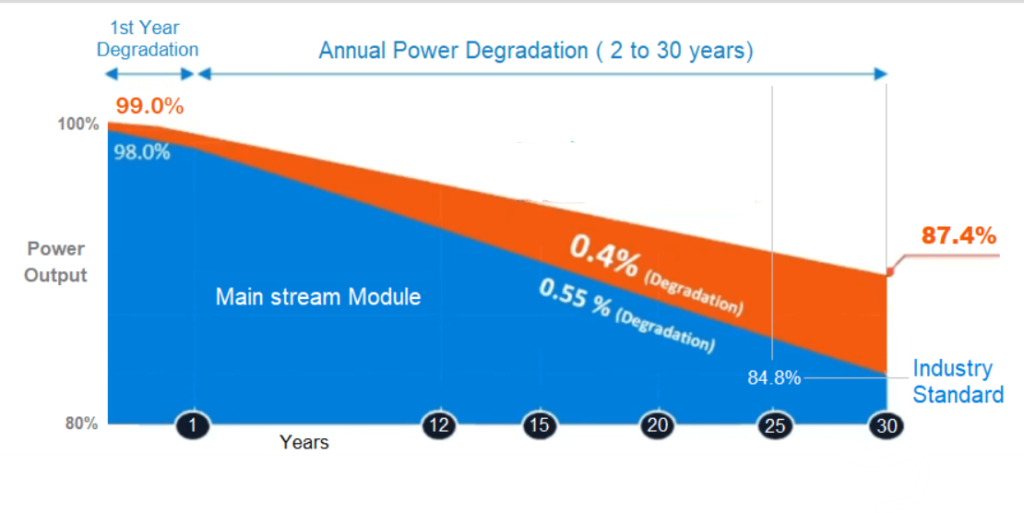 - Annual Power Degradation: After this, the rate of LID reduces significantly, reducing to 0.3% to 0.6% per year for the next 25+ years.