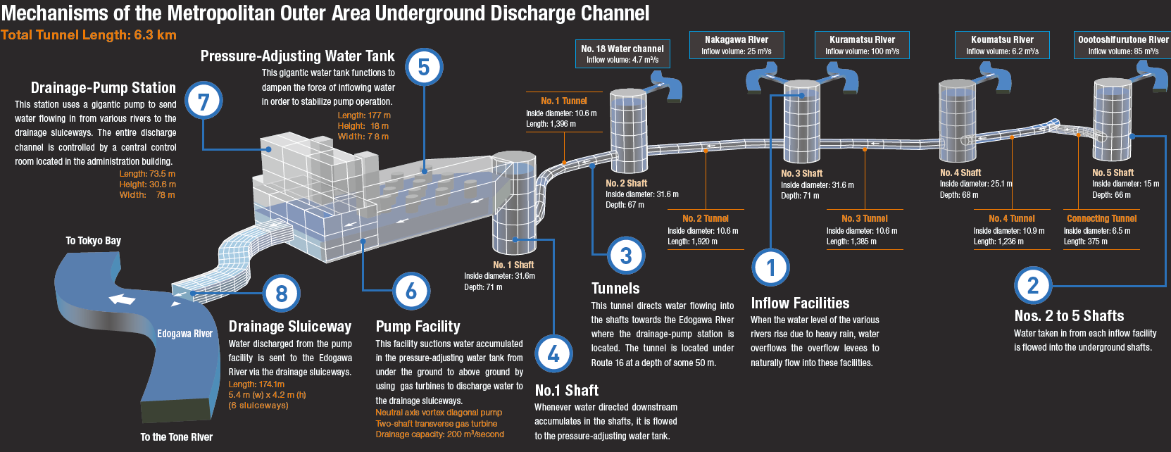- Water Collection: During heavy rainfall, water flows into the system through five intake silos. The collection occures at these different points: Ootoshifurutone River, Koumatsu River, Kuramatsu River, Nakagawa River and No. 18 Water channel.